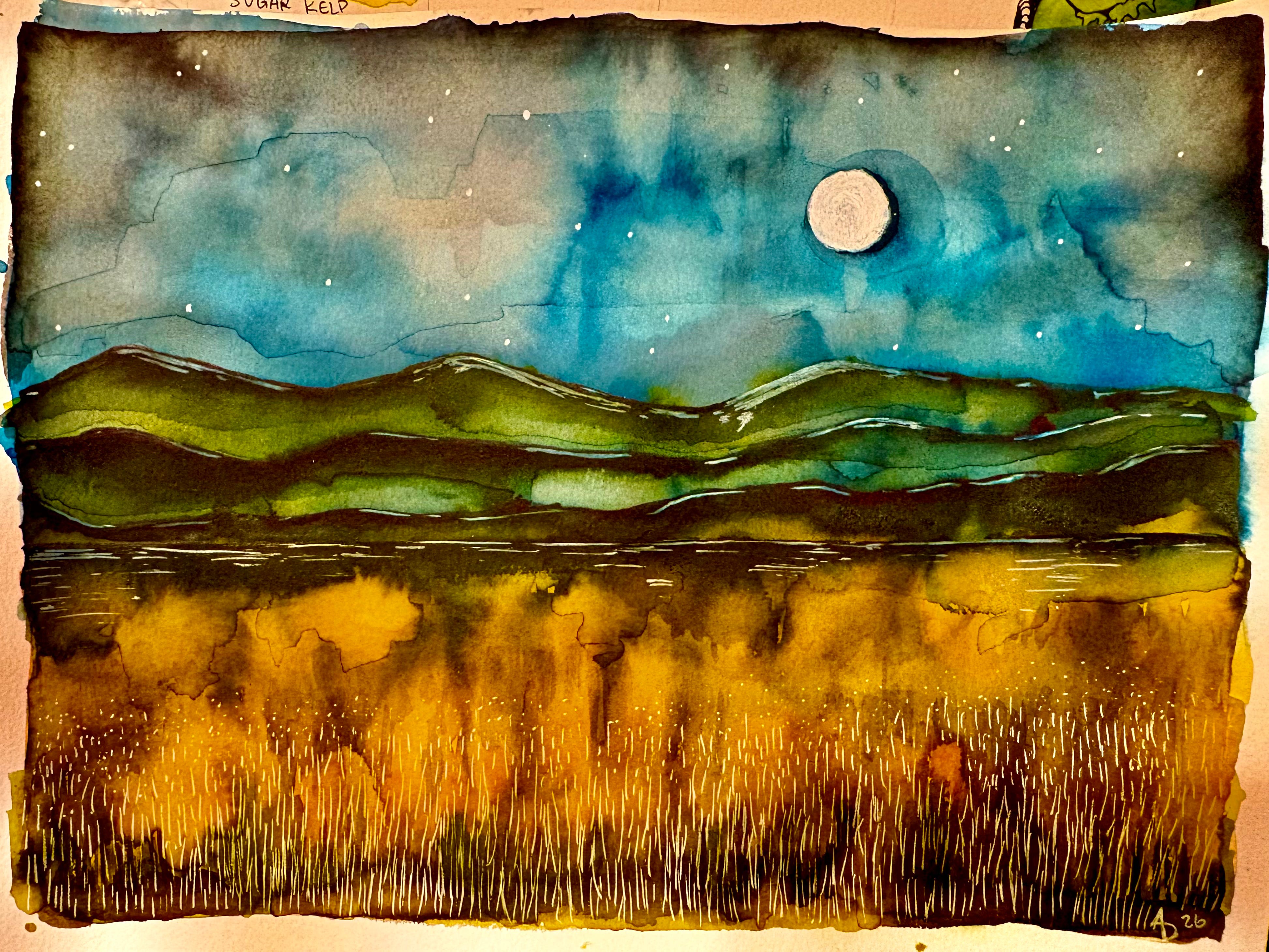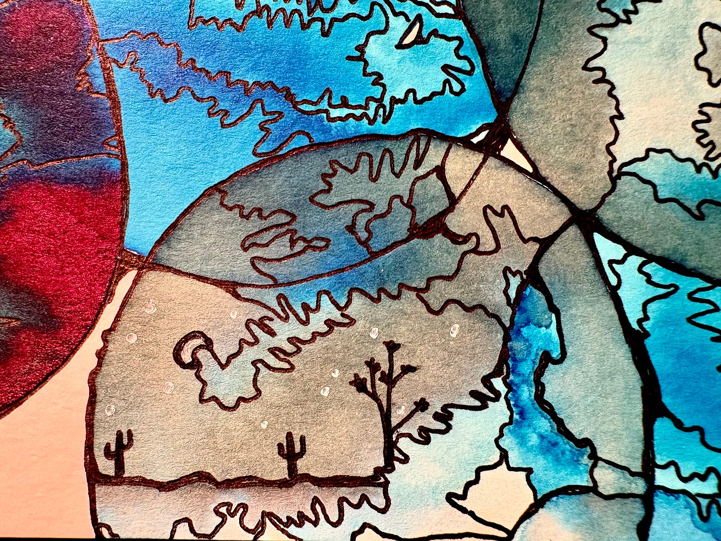 I find myself 14 days into the project and I am creating. Creating fantasy ink landscapes with tiny stories embedded in their color changes. I am also working on a larger mixed media project, with texture, ink, and goauche. I find the desire to write returning in the process, loosening the friction of an old pattern.